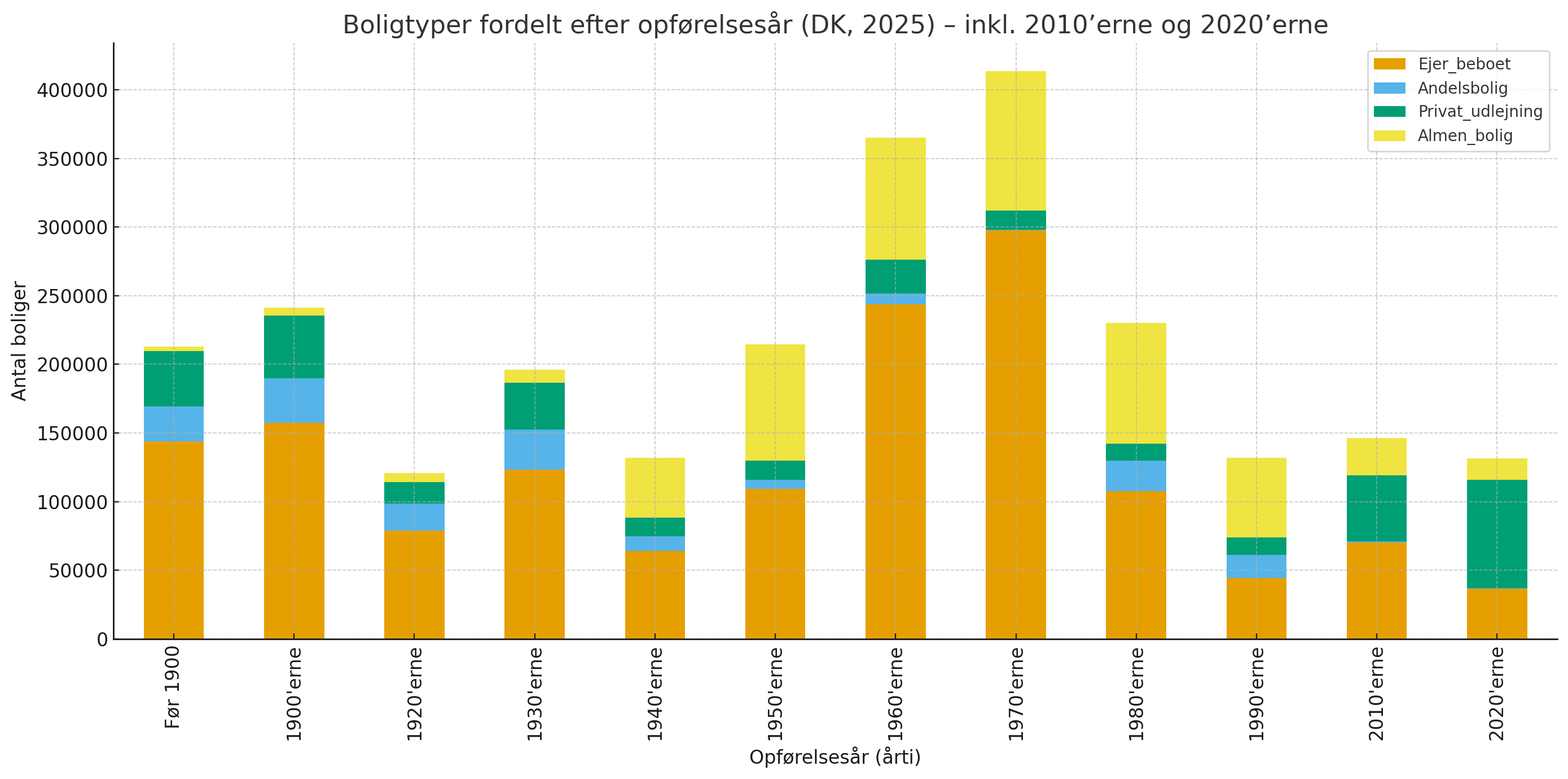 I de årtier, hvor Danmark havde huslejeloft (hovedsageligt 1939-1992), blev der bygget flest boliger – både ejer- og almene boliger. Figuren viser hvornår de boliger, der findes i Danmark i 2025 er opført, og er fordelt på boligtype. Den er baseret på Danmarks Statistik BOL101.