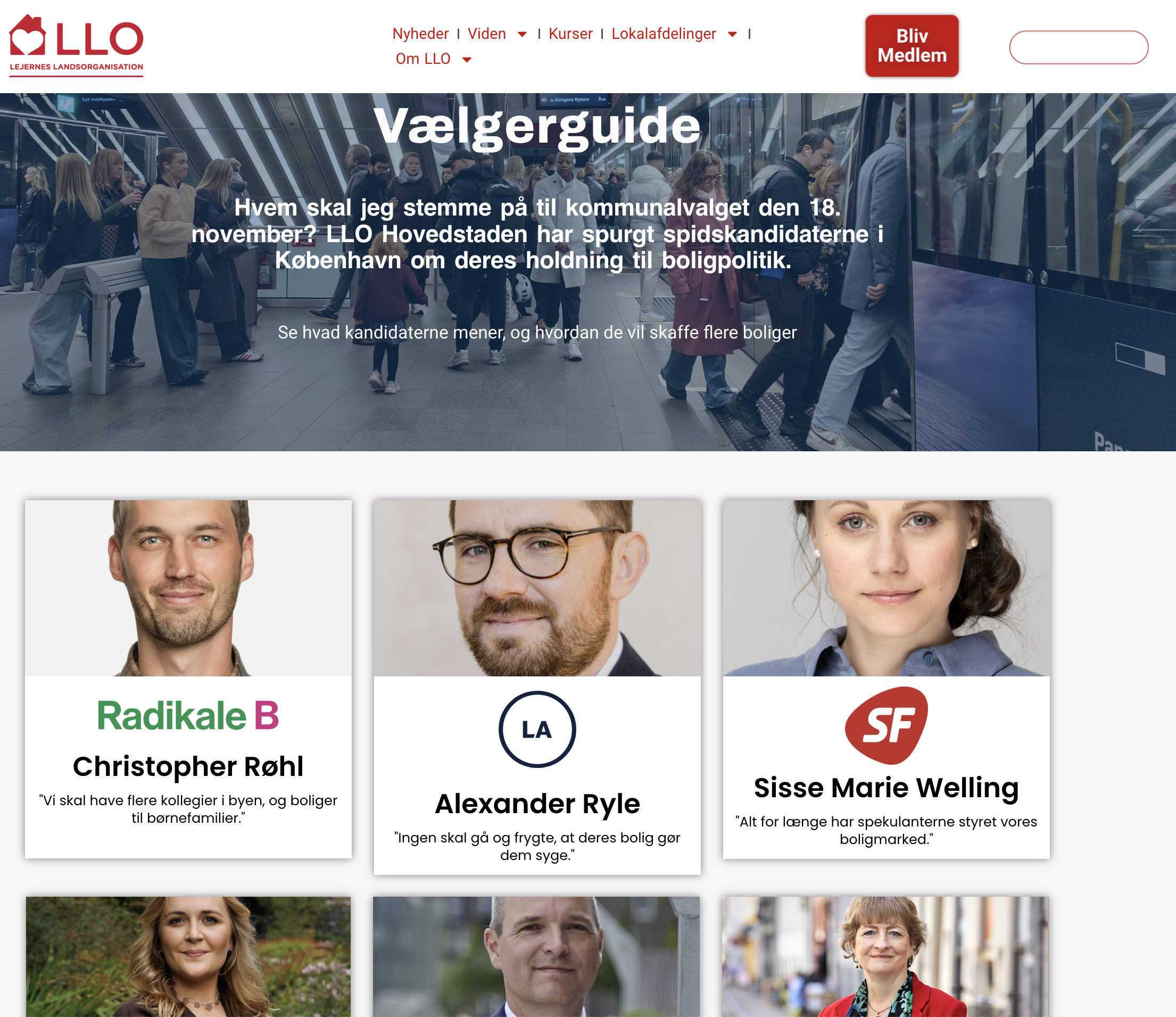 Lejernes LO Hovedstaden har lavet en vælgerguide med svar fra de 11 spidskandidater i København om deres holdning til boligpolitik. Skal borgere ramt af skimmelsvamp genhuses hurtigt, skal der indføres huslejeloft, skal der bygges flere ejerboliger, hvordan får unge uden velhavende familie fodfæste på boligmarkedet, og skal der tages et opgør med ulovlig Airbnb-udlejning?