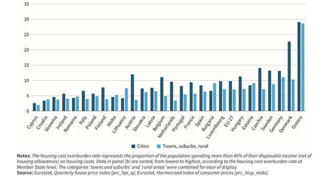 Hvor 14 procent af husholdningerne i EU oplever såkaldt ”boligoverkommelighedsstress”, er andelen endnu højere i Danmark: Over 20 procent af danskerne i storbyerne er voldsomt pressede. Kun grækerne er foran Danmark, når det kommer til ”housing cost overburden”. Det betyder, at man bruger mere end 40 % af sin indkomst på boligudgifter (husleje og forbrug af el, varme, vand).