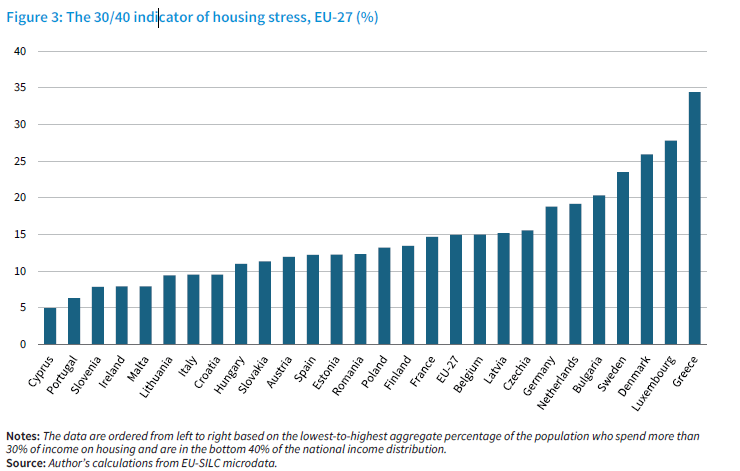 ”På tværs af EU oplever 14 % af husholdningerne økonomisk pres på boligområdet ifølge dette mål. Indikatoren peger også på, at lejere står over for særlige udfordringer, idet 31 % af dem, der lejer til markedspris, og 25 % af dem, der lejer til nedsat husleje, oplever økonomisk pres i forhold til boligudgifter”.