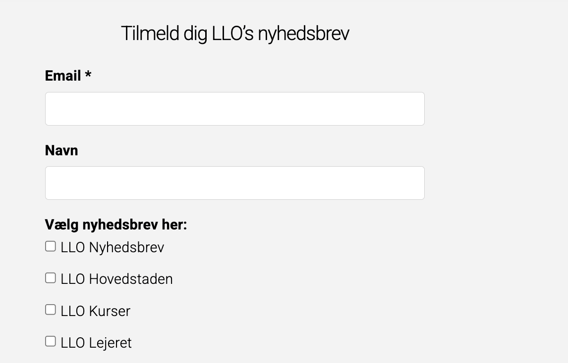 Hvis du er personligt medlem, får du allerede nyhedsbrevene. Kontaktpersoner og formænd i foreninger, der er tilknyttet LLO, får det store nyhedsbrev tilsendt, men alle andre lejere i foreningerne får det ikke automatisk. Da vi ikke har mailadresser på alle lejerne i foreningerne, skal de selv tilmelde sig aktivt.