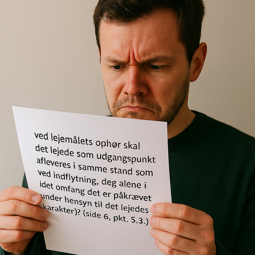 Kort sagt betyder det, at det lejede skal afleveres i samme stand, som det blev modtaget – for de dele, du har vedligeholdelsespligten for.